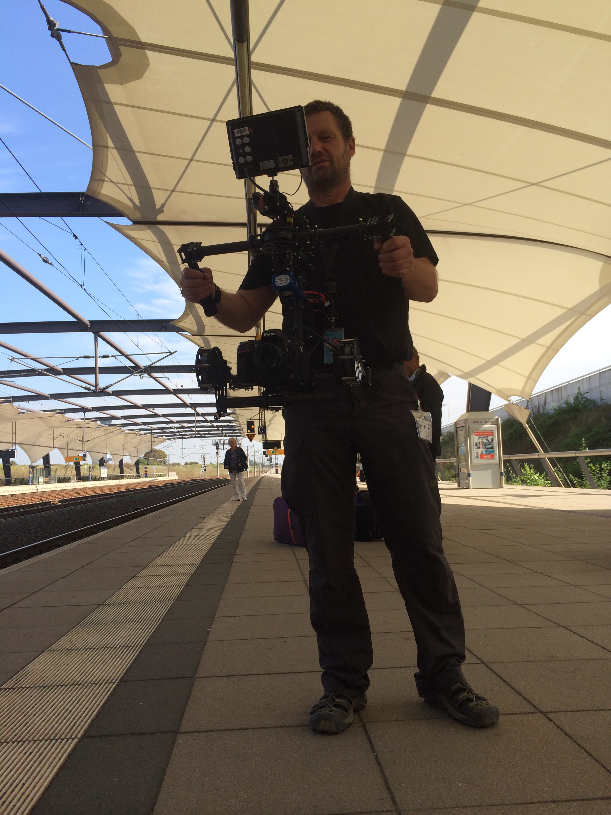 Uwe, mit unserem neuem Steady Gimbal AM 32-Bit, als Filmkamera die Nikon D800 integriert, auf dem Bahnhof des Leipziger Flughafens‘ bei Filmaufnahmen.